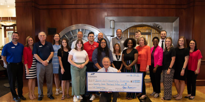 Officials from Texas A&M University-Texarkana, Texarkana College, and the University of Arkansas Hope-Texarkana recently gathered at Farmers Bank & Trust to celebrate a group of students who are receiving scholarships to Texas A&M University-Texarkana for the upcoming semester.