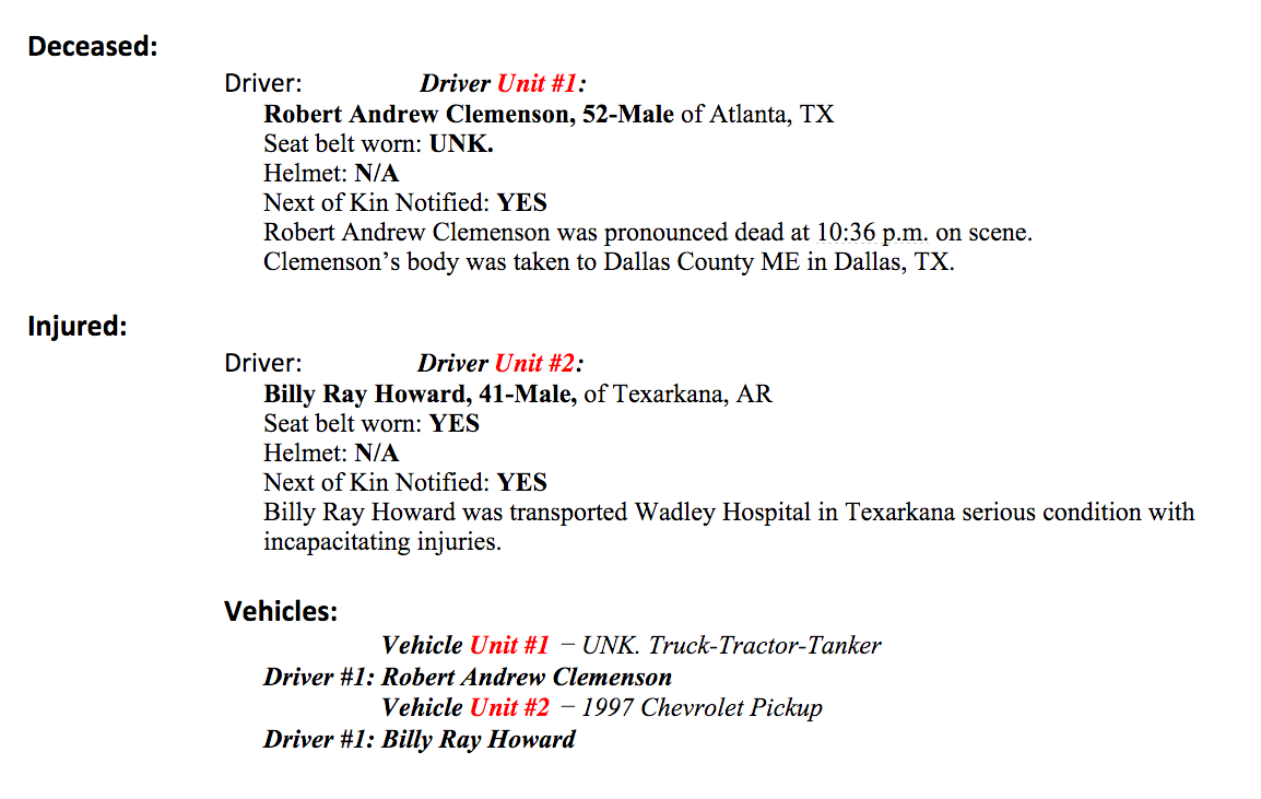 According to the report Clemenson was pronounced dead on scene at 10:36 p.m. his body was taken to the medical examiner in Dallas. Howard was transported to Wadley and is in serious condition with incapacitating injuries.