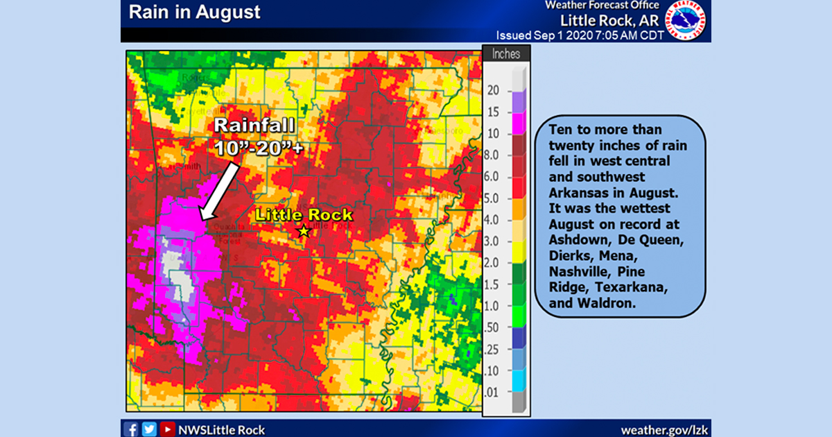 According to the NWS, southwest Arkansas received from 10-20 inches in the month of August.
