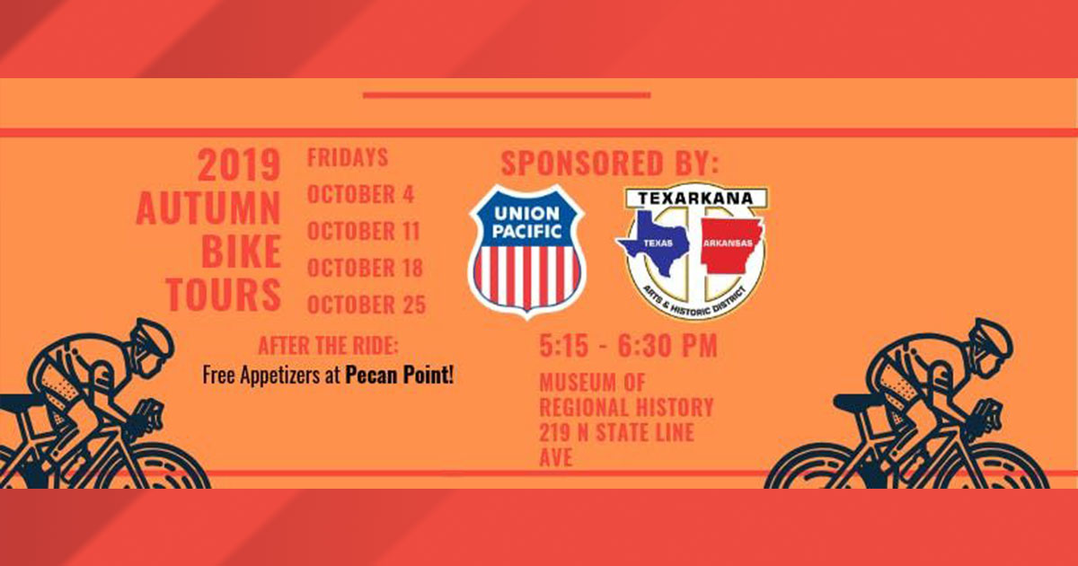 Every Friday this October, the Texarkana Arts & Historic District will have bike tours of historic downtown Texarkana! Meet at 5:15 PM at the Museum of Regional History (219 N State Line Ave.) and be ready for an approximately hour-long leisurely ride around the downtown area.