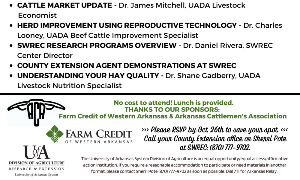 There is no cost to attend the Beef and Forages Field Day, but registration is required by Oct. 26. Call Sherri Pote at (870) 777-9702 to register.