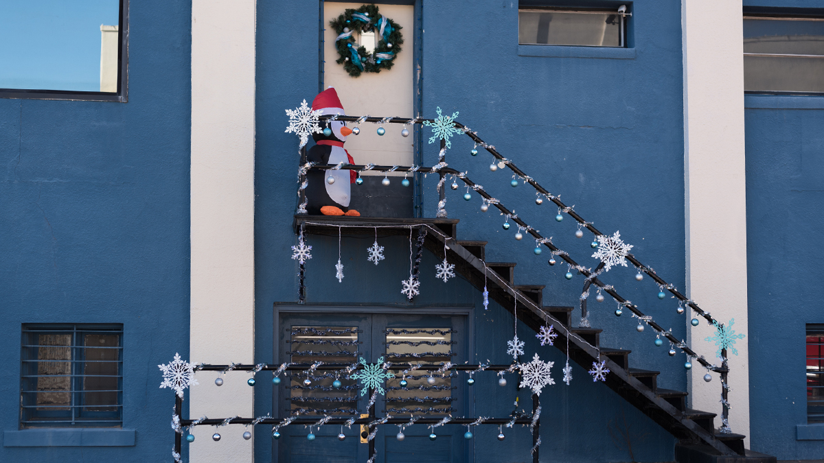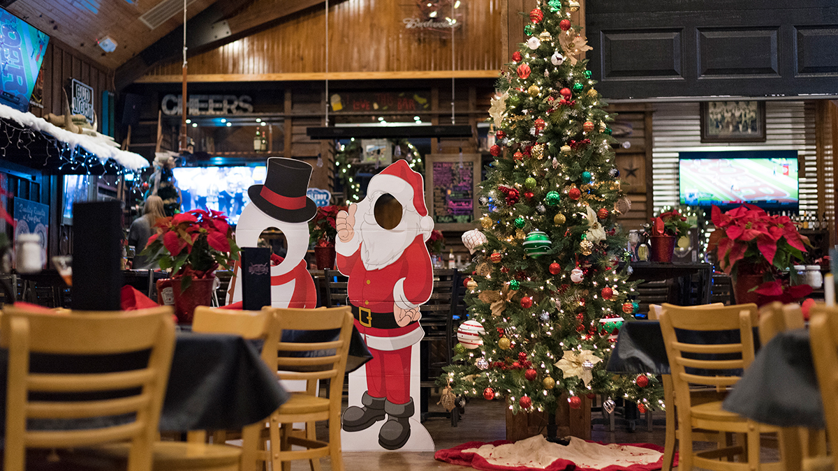 Decorations range from snow-topped bars to giant ornate wreaths on nearly every door. Bring the family along and take photos with the Santa and Snowman photo cutouts.