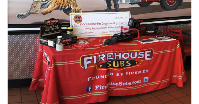 To celebrate the receipt of this lifesaving grant, C-5 Volunteer Fire Lieutenant Justin Binnings and Assistant Chief John Alquist joined local franchisee KC Jones at her Firehouse Subs restaurant on Kennedy Lane for an acknowledgment ceremony and check presentation.