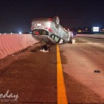 The car first hit the guard rail on the right side of the road and then flipped over coming to rest against the bridge guard rail on the other side of the highway. The condition of the driver is unknown.