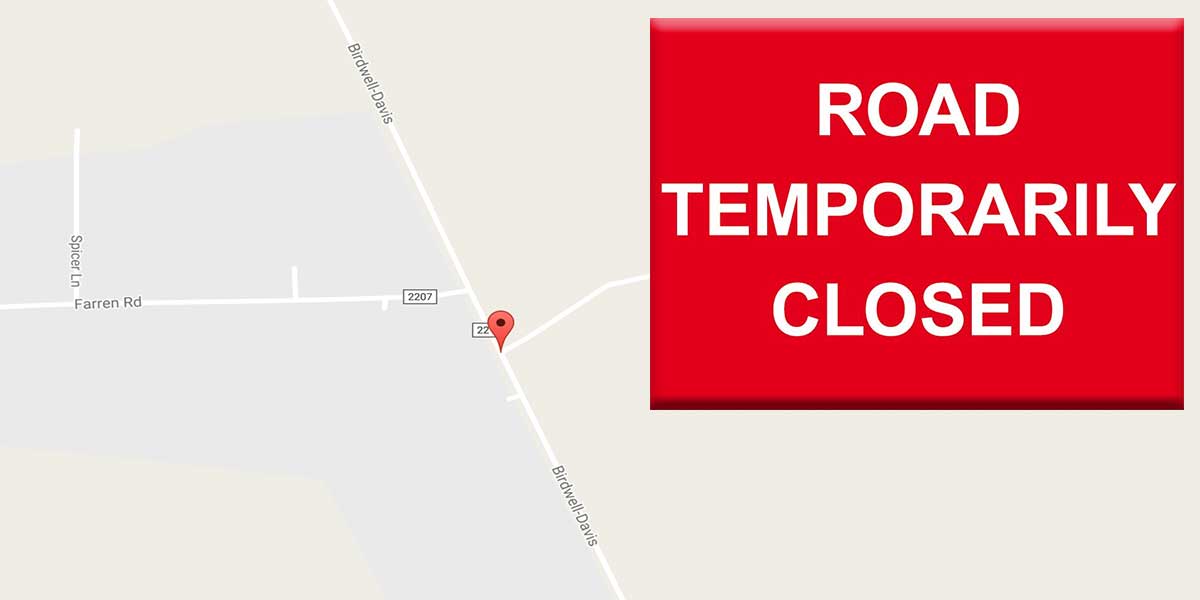 The City of Red Lick will be closing Birdwell-Davis Road from Farm to Market Road 2148 to Arnold Lane on September 14, 2016 for approximately three weeks for road construction.
