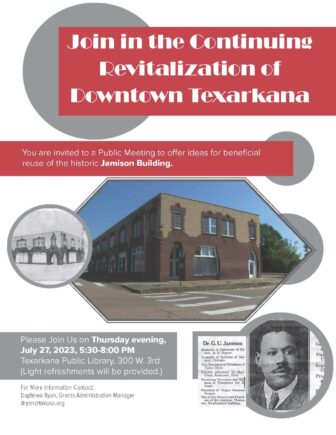 The City of Texarkana, Texas invites the public to a community engagement meeting on Thursday, July 27th, starting at 5:30 p.m. at the Texarkana Public Library to discuss the revitalization of the historic downtown Jamison Building. This discussion will present a valuable opportunity for the community to participate and contribute their insights. Participants can play a vital role in the redevelopment planning process while addressing the needs of the community.