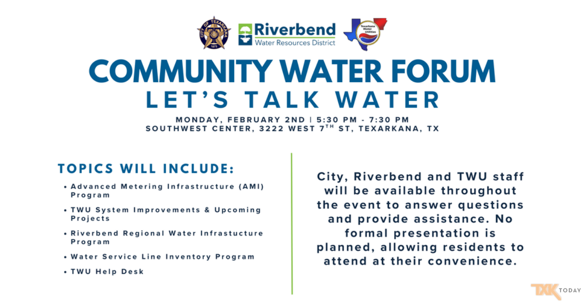 The City of Texarkana, Texarkana Water Utilities, and Riverbend Water Resources will host a Community Water Forum on Monday, February 2, from 5:30 p.m. to 7:30 p.m. at the Texarkana, Texas Convention Center.