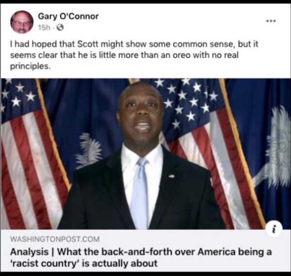 Whereas the Chairman for the Lamar County Democratic Party of Texas, Gary O’Connor, posted a defamatory and racist remark against Senator Tim Scott of South Carolina on Facebook, in which he referred to the Senator from South Carolina as an ‘‘oreo’’;