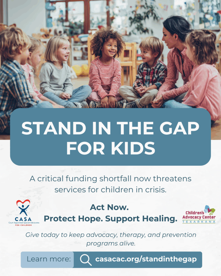 CASA for Children and the Texarkana Children’s Advocacy Center (TCAC) are calling on the Greater Texarkana community to stand in the gap for children in crisis. A $415,000 annual funding shortfall now threatens the vital services provided by CASA and TCAC, including advocacy, therapy, forensic interviews, and prevention education for children who are at risk, in crisis, or in need of support. These services give children and supportive family members advocacy, guidance, and access to resources to help them heal and stay safe.