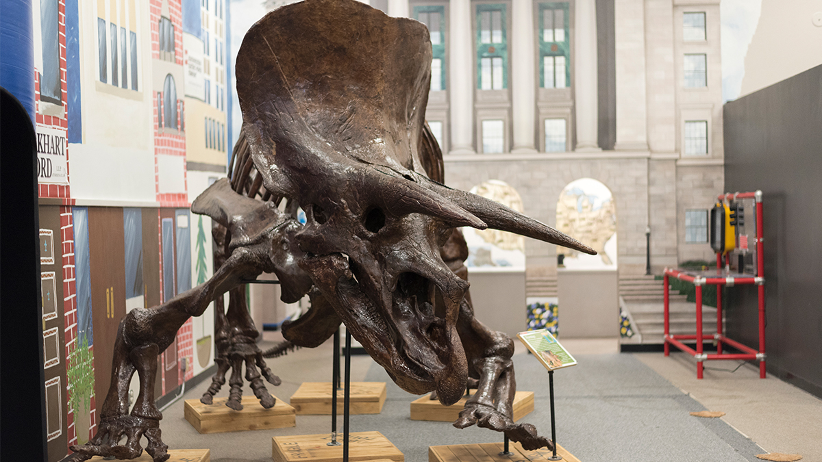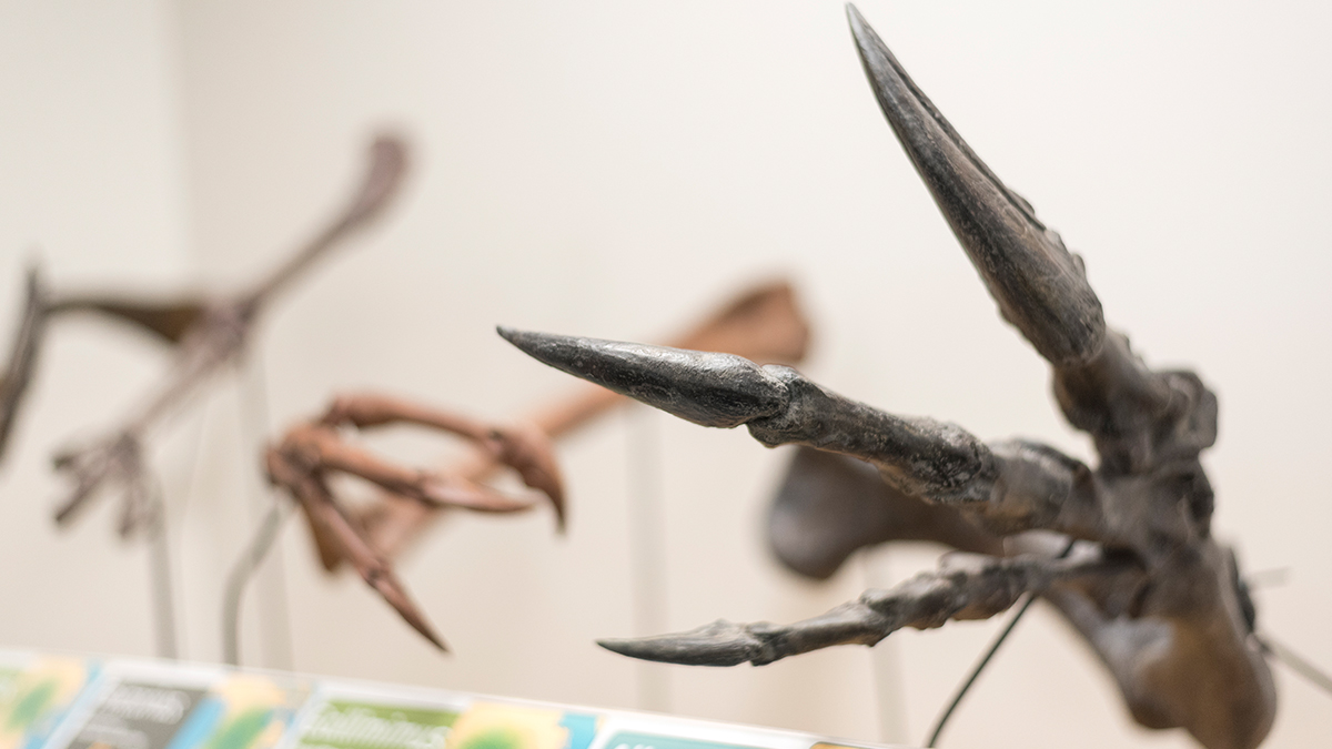 The temporary exhibit features fossils from big and small, allowing visitors to discover the past with dinosaurs like the 70 foot tall apatosaurus, formally known as the brontosaurus , and the smaller rhamphorhynchus dinosaur that flies.