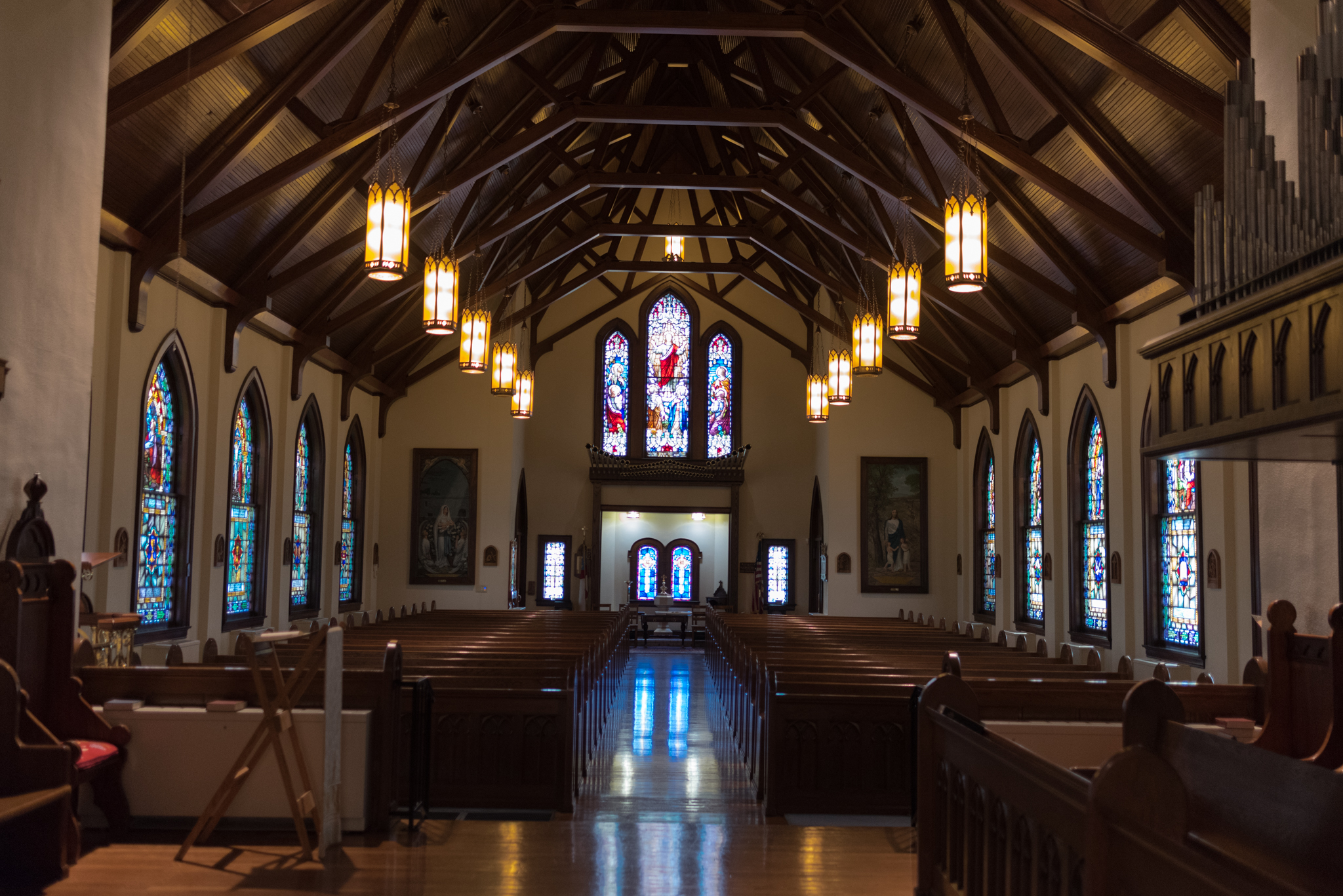 St. Edwards is graced with a ethereal altar of Carrara marble, accessorized by ornate, classical statues. The church contains 4 large, round stained glass window that depict the 7 sacraments: the birth of Christ, the birth of St. John the Baptist, and St. Gregory the Great, with the smaller windows depicting the lives of Jesus and Mary.