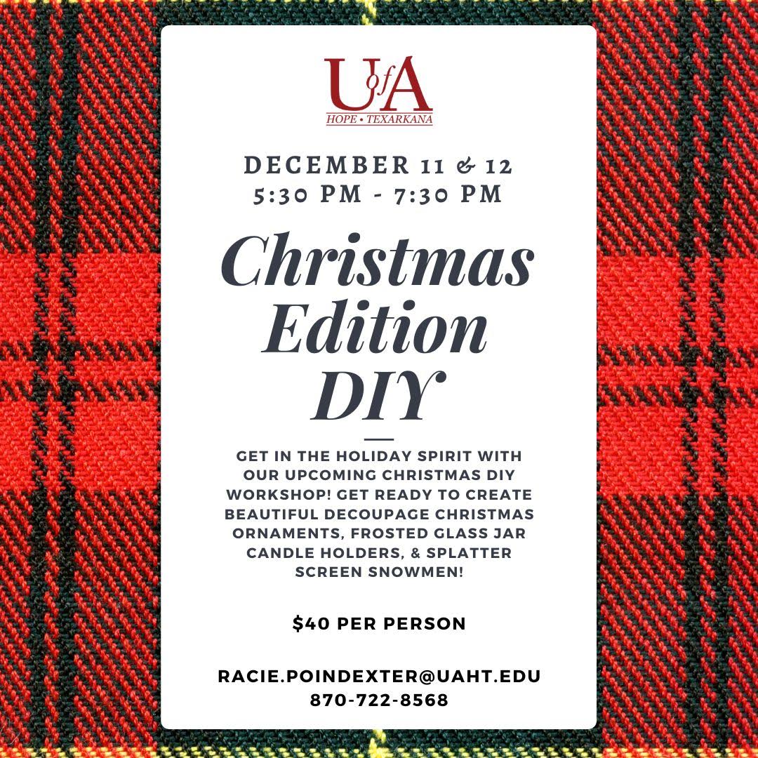 The University of Arkansas Hope-Texarkana will hold a DIY Christmas Decoration class on December 11 and 12 from 5:30 to 7:30 p.m. at the UA Hope campus. Get in the holiday spirit and prepare to create beautiful decoupage Christmas ornaments, frosted glass jar candle holders, splatter screen snowmen, and so much more! Our expert instructors will guide you every step of the way. So, whether you’re a seasoned DIYer or a first-timer, you’ll have a blast bringing your holiday decor visions to life. Don’t miss out on this festive opportunity to get crafty with us.