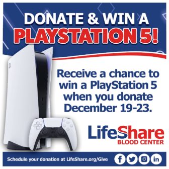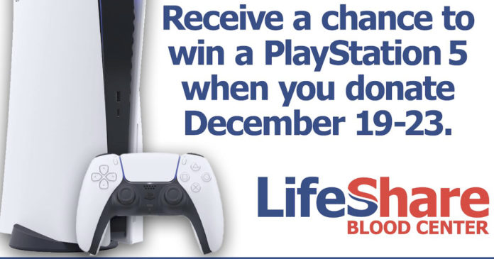 All donors who give blood through Thursday, December 23rd will be entered into a drawing to receive a FREE Sony PlayStation 5, as well as a LifeShare t-shirt.