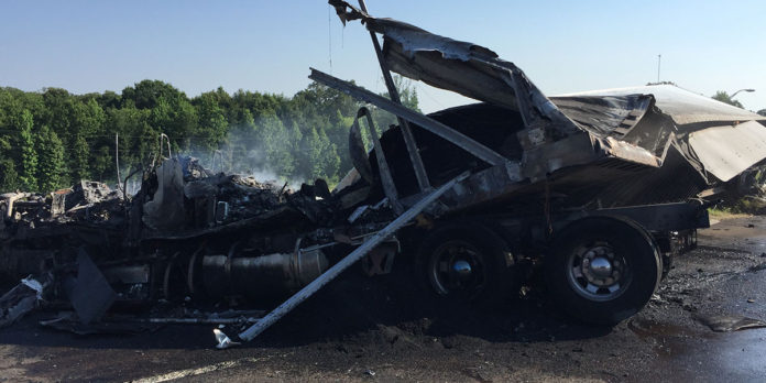 The accident involving a semi-truck took place when the driver lost control of the vehicle causing the truck to crash and catch on fire.