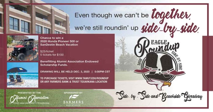 The Texas A&M University-Texarkana Alumni Association is holding a giveaway for a Sandestin beachside vacation and a Honda Pioneer 500 UTV instead of hosting the annual Eagle Roundup celebration on the university campus. The Eagle Roundup, normally held each October, is an on-campus event featuring live music, a silent auction, and a BBQ dinner. The event honors a group of distinguished alumni and friends of the university and raises much needed scholarship funds for TAMUT students.