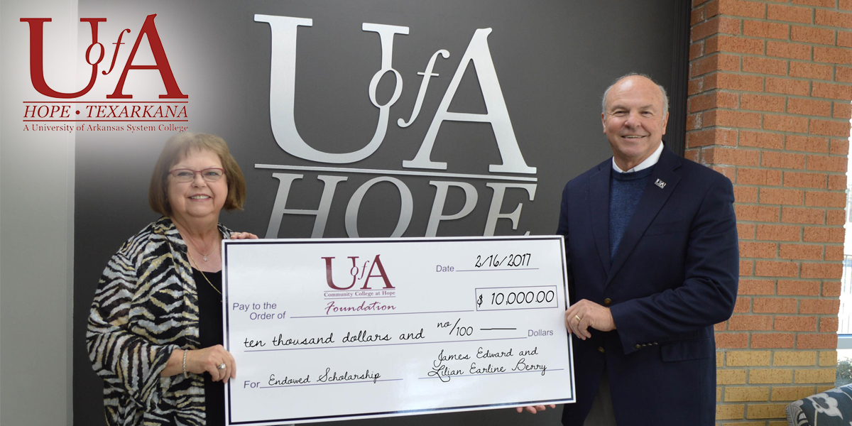 Dennis and Linda Ramsey, of Hope, Arkansas, recently donated $10,000 to establish the James Edward and Lillian Earline Berry Endowed Scholarship at the University of Arkansas Hope-Texarkana. The endowment was set up to honor the memory of the parents of Linda Ramsey and will provide financial assistance to a student pursuing a degree or certificate from UAHT.