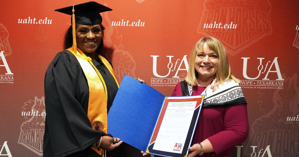 Brenda Morrell of Texarkana, Texas, was selected for the 2020-21 Leadership Texarkana Class Scholarship at the University of Arkansas Hope-Texarkana. Morell was presented with the scholarship at the UAHT commencement ceremony on Tuesday, where she graduated Cum Laude with an Associate Degree in Early Childhood Education. Brenda will transfer to Texas A&M University-Texarkana this fall to pursue a bachelor’s degree in education.