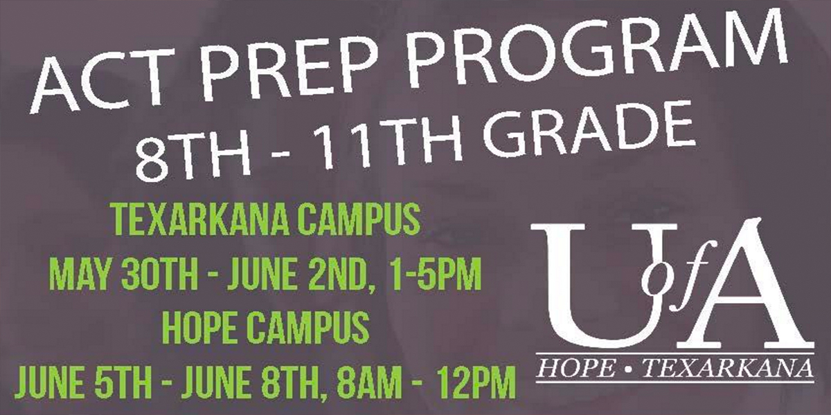 The University of Arkansas Hope-Texarkana will hold two upcoming ACT Prep Workshops for students in 8th through 11th grades. The Texarkana campus will hold a workshop on May 30 through June 2 from 1:00 p.m. to 5:00 p.m. The Hope campus workshop will be held on June 5 through June 8 from 8:00 a.m. to 12:00 p.m.