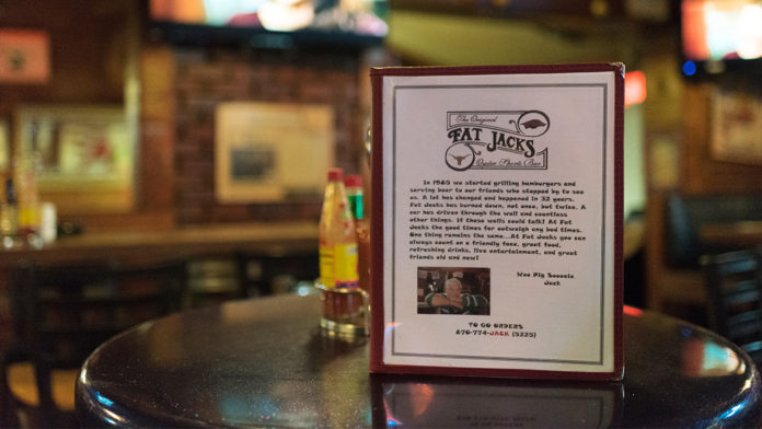 The walls of Fat Jacks are embellished with local memorabilia gleaming with Razorback and Tiger pride. Tables were occupied by several men discussing business and life, remembering the days when they had less responsibilities and higher alcohol tolerances.