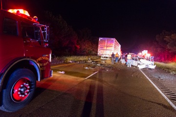 EMTs and paramedics from Nevada County Ambulance Service and Pafford EMS worked to stabilize the driver while firefighters from Prescott Fire Department and Nevada County Fire and Rescue worked to disentangle him from the car. The driver was finally freed and moved to an ambulance to be stabilized before being transferred to the LifeNet Helicopter that landed on the closed interstate. He was flown to St. Michaels.