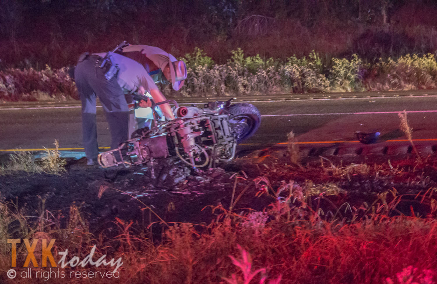When first responders arrived on scene the motorcycle and the grass around it were on fire. The motorcycle driver was pronounced dead on the scene. The condition of the occupants of the truck is unknown at this time although there appeared to be no major injuries.