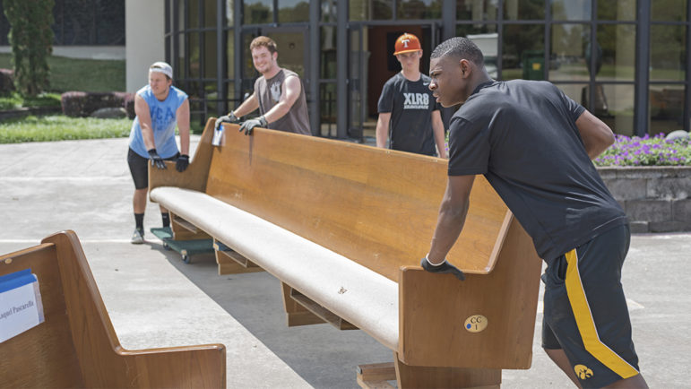 Volunteers remove the original pews at First Baptist Church on Moores Lane.