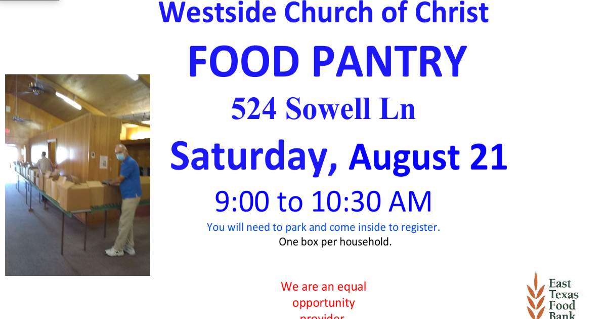 Westside Church of Christ at 524 Sowell Lane will be having a Food Pantry Distribution on Saturday, August 21, from 9:00 to 10:30 AM. We will be giving out 25 pound boxes of food, one per family. If you need help, please come.