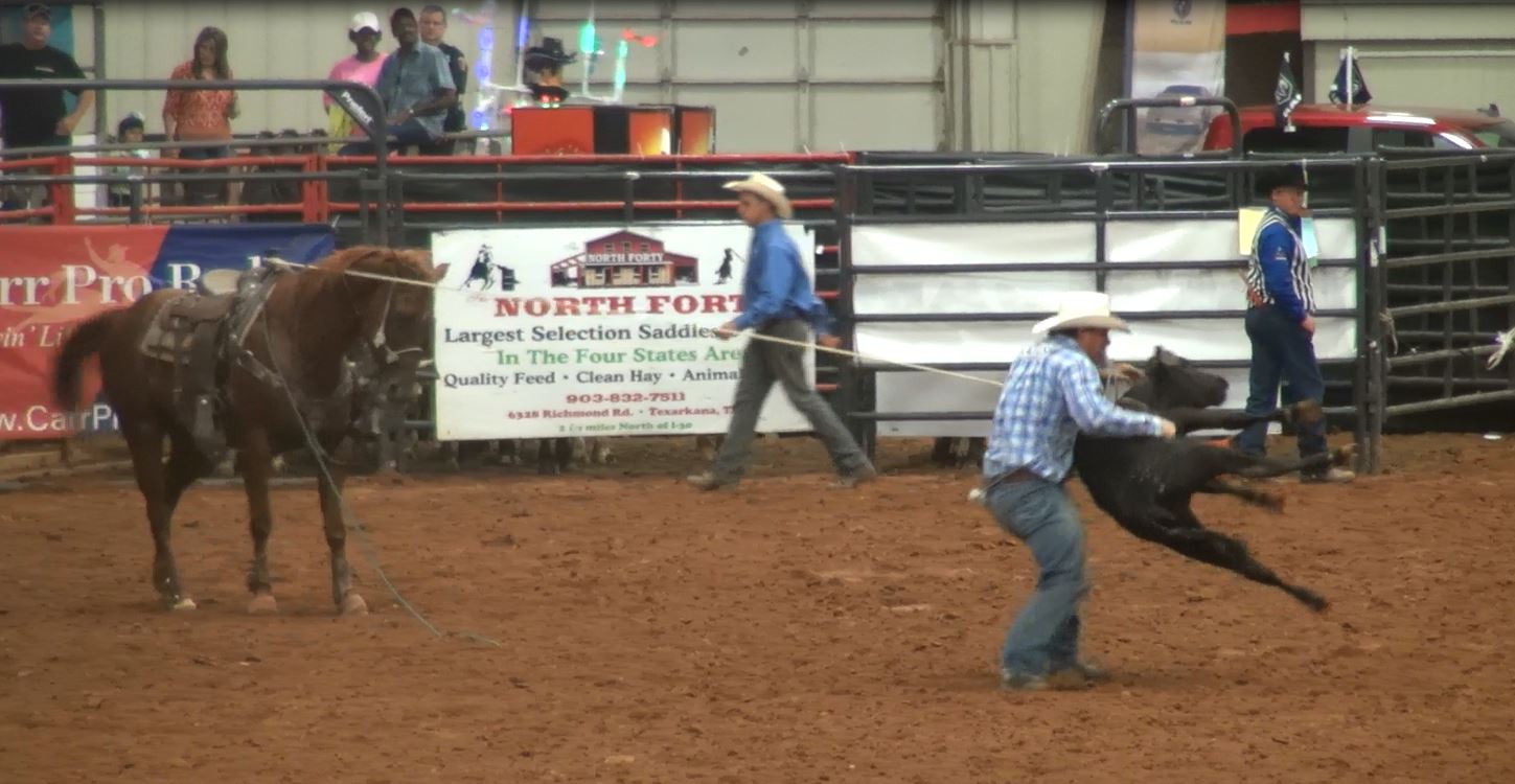 Team roping leaders: 1. Chase Wiley/Ace Pearce, 4.8 seconds; 2. John Alley/Clark Adcock, 4.9; 3. Payden Emmett/Chad Harper, 5.1; 4. (tie) Drew Horner/Buddy Hawkins II and Mike Bacon/Joseph Harrison, 5.4 each; 6. David Key/Boogie Ray, 10.0.