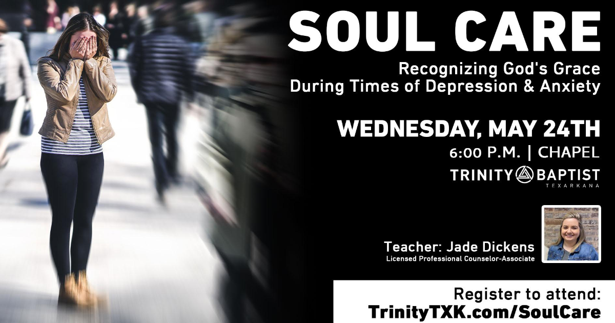 “Soul Care | Recognizing God’s Grace During Times of Depression & Anxiety” will be held in the Chapel from 6:00-7:00 p.m.