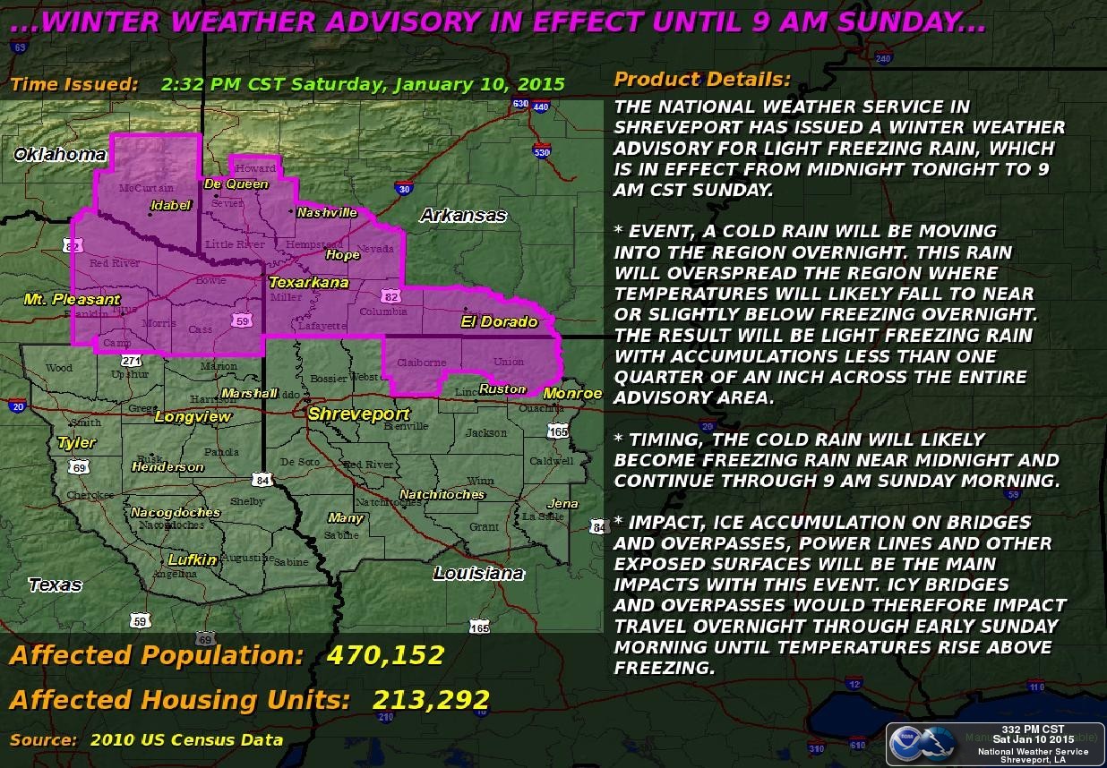THE NATIONAL WEATHER SERVICE IN SHREVEPORT HAS ISSUED A WINTER WEATHER ADVISORY FOR LIGHT FREEZING RAIN… WHICH IS IN EFFECT FROM MIDNIGHT TONIGHT TO 9 AM CST SUNDAY.