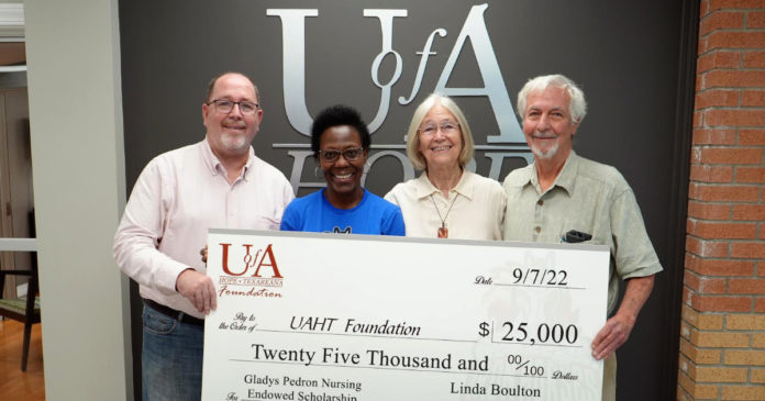 The Gladys Pedron Nursing Endowed Scholarship was recently established at the University of Arkansas Hope-Texarkana by Linda Boulton and her family in memory of her aunt, Gladys Pedron. Preference for the scholarship is given to a student pursuing a degree in Nursing at UAHT.