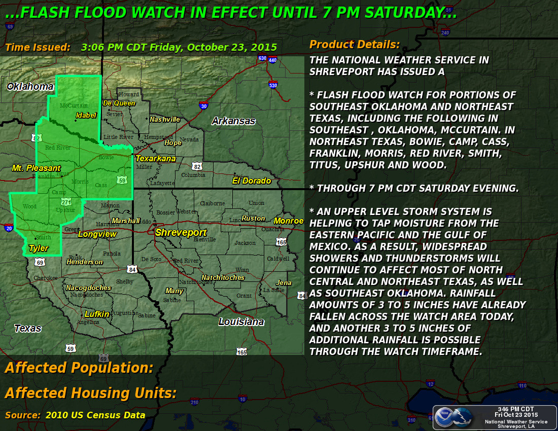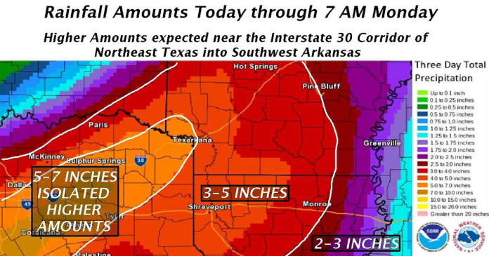 SATURDAY INTO SATURDAY NIGHT…THE WESTERN HALF OF THE FOUR STATE REGION…INCLUDING ALL OF NORTHEAST TEXAS…SOUTHEAST OKLAHOMA… SOUTHWEST ARKANSAS AND EXTREME NORTHWEST LOUISIANA WILL SEE THE GREATEST RAINFALL CHANCES WITH AN ADDITIONAL 1 TO 3 INCHES POSSIBLE SATURDAY MORNING THROUGH EARLY SUNDAY MORNING.