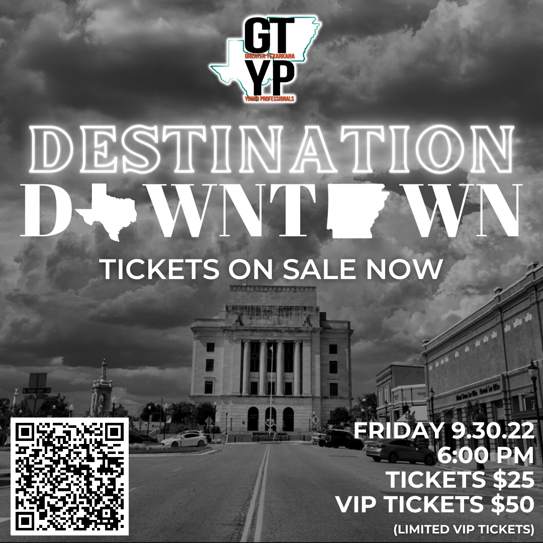 The Greater Texarkana Young Professionals (GTYP) are set to host their Destination Downtown event September 30, 2022. The event will begin at 5:30 PM for VIP ticket holders at Crossties in Texarkana, AR. General admission check-in will begin at 6:00 PM at El Frio Express and Hopkins Icehouse. VIP tickets are limited, and sold on a first-come, first-serve basis.