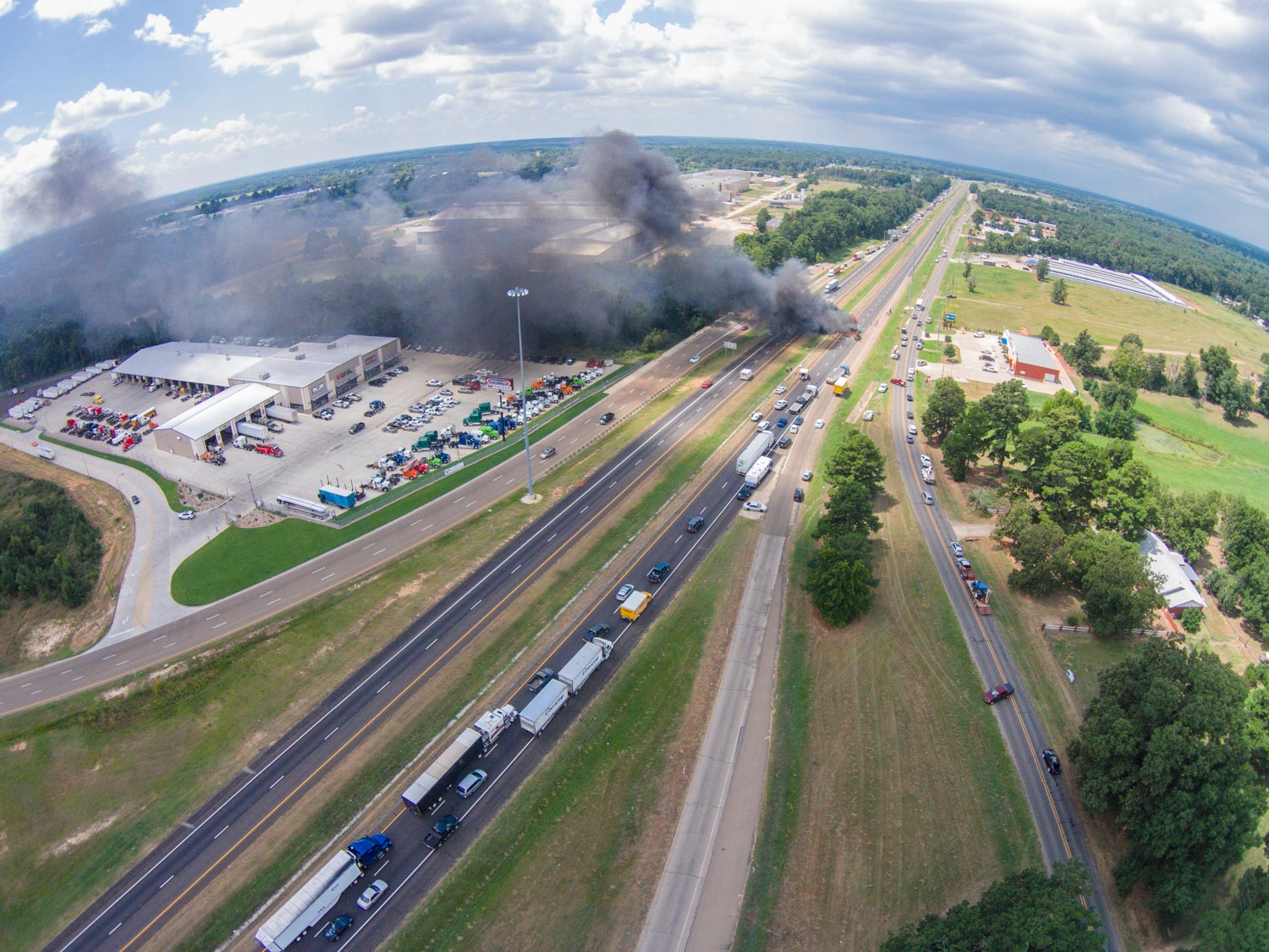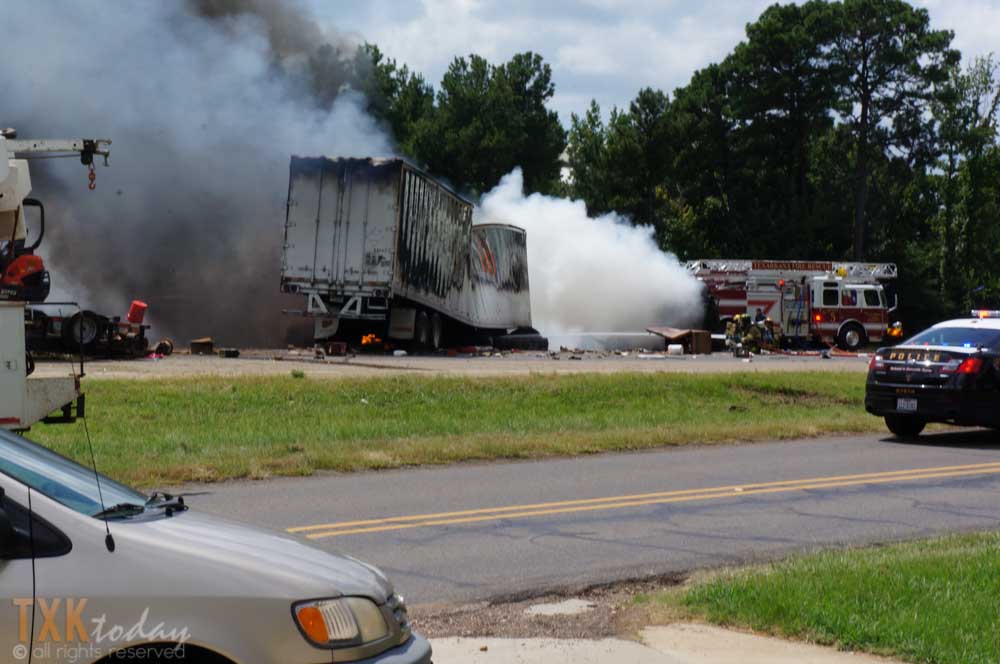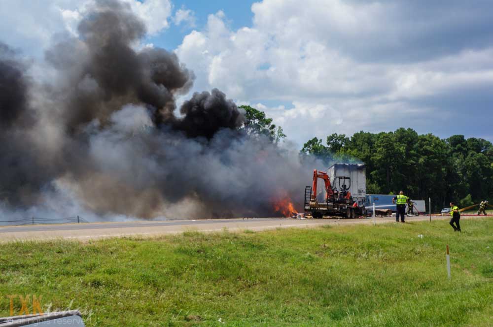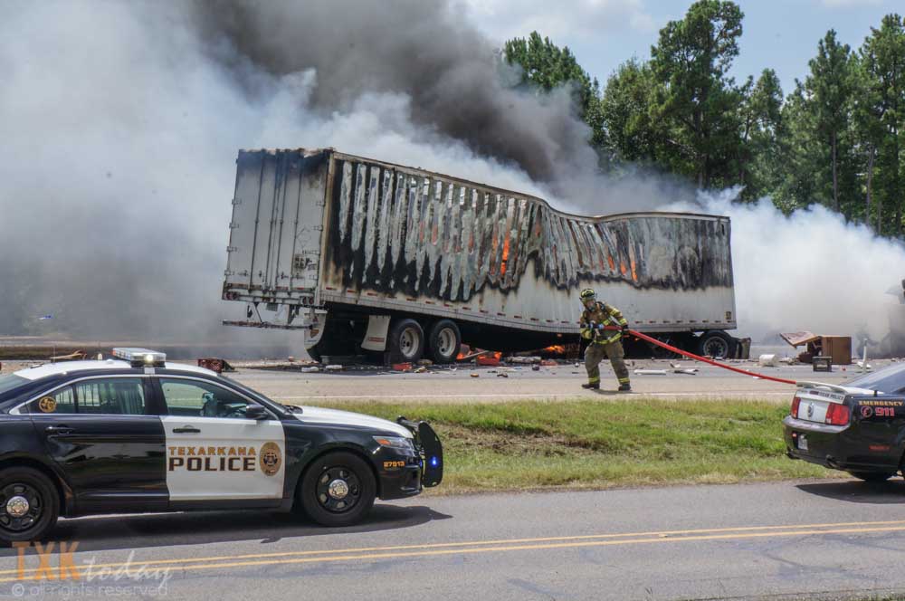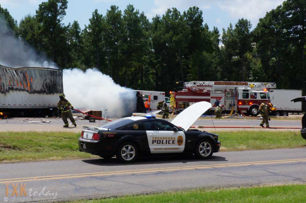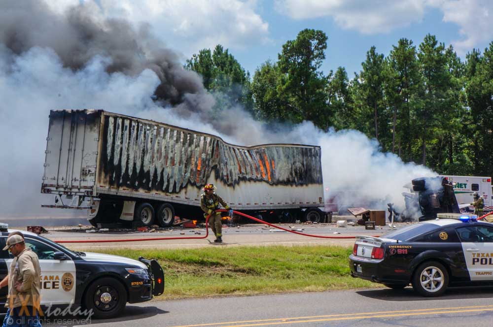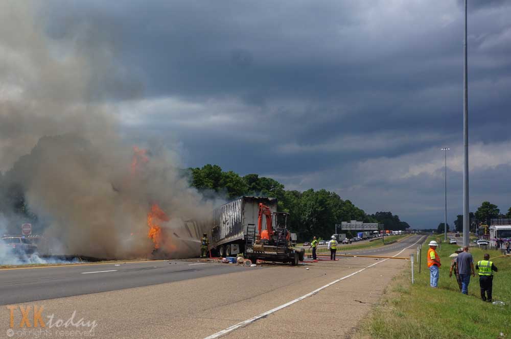 1:10 P.M Tuesday | Both directions of I-30 westbound were closed for a major accident near Nash, Texas. From on scene witnesses and tire marks it appears a vehicle was traveling eastbound pulling a trailer on the North Service Road when they lost control for an unknown reason and entered I-30 westbound lanes colliding with an 18 wheeler.