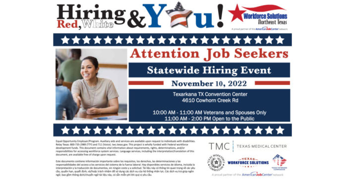On November 10, 2022, Workforce Solutions Northeast Texas will host the Red, White, and You! Hiring Fair from 10:00 a.m. to 2:00 p.m. at the Texarkana Convention Center, located at 4610 Cowhorn Creek in Texarkana, Texas. The first hour of the event, 10:00 – 11:00, is for Veterans and spouses only. The public is welcome to attend from 11:00 – 2:00.