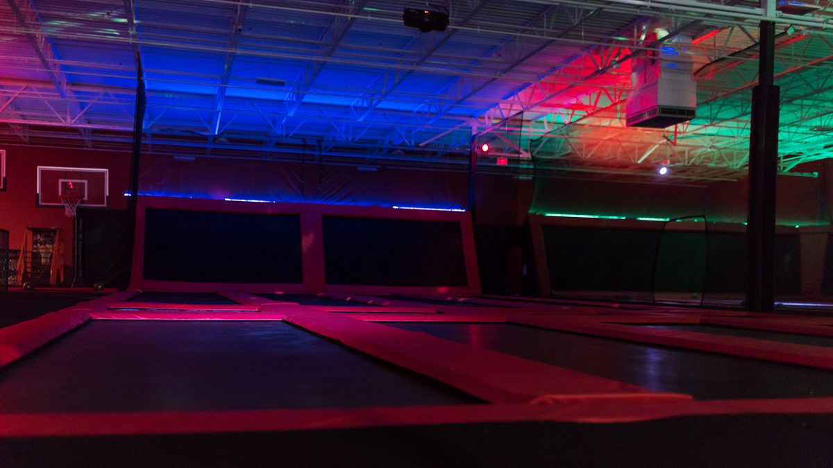 iJump had the windows tinted so the lights can be on for extended periods of time. “From 8-10 its prime time. light show on , lights off. Friday night is date night, from 7-9 , you can drop off 2 children for $30 !”