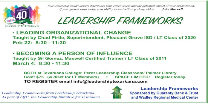 As part of the organization’s new Leadership Frameworks offerings for the community, Leadership Texarkana will be presenting two half-day leadership seminars in the coming two weeks: