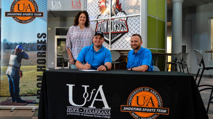 Nicholas Lerew of Hope, Arkansas, accepted a scholarship today to shoot with the University of Arkansas Hope-Texarkana Iron Horse Shooting Team. The scholarship, funded by Smiles of Arkansas Dental Center, is good for up to $650 for the academic year. Nicholas is the son of Troy Jr. and Terry Brown Lerew. He plans to major in General Education at UAHT and transfer to Trinidad State University in Trinidad, Colorado, to pursue a degree in Gunsmithing.
