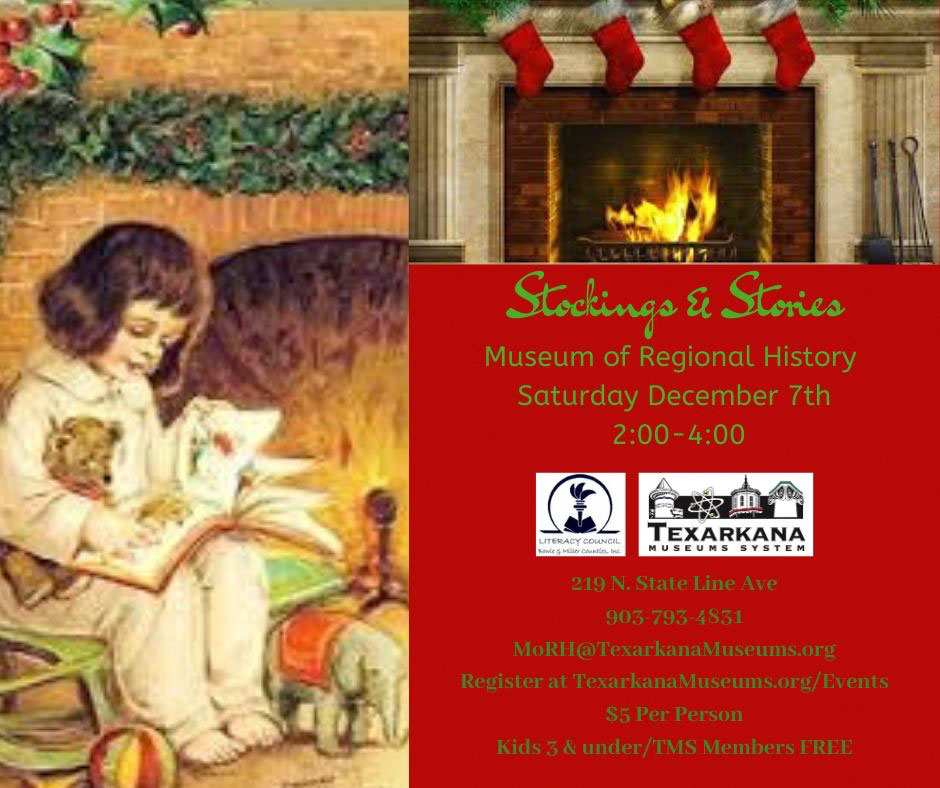 Get your Jingle on with the Texarkana Museums System as we begin the holiday season with Stockings & Stories at the Museum of Regional History Saturday, December 8th, 2:00-4:00. Decorate a stocking while Christmas classics are read aloud! Supplies will be provided. $5.00 per person/TMS Members and children 3 & under are free.