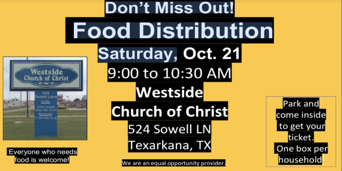 “If your need for food is outrunning your available money, we are here to help you. Westside Church of Christ, 524 Sowell LN, will have a food distribution from 9:00 to 10:30 AM this Saturday, Oct. 21. We welcome everyone from Texas and Arkansas. We have 200 boxes available. Please come.”