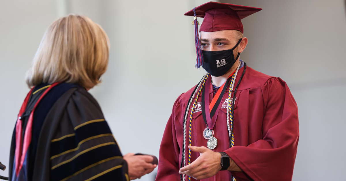 The commencement exercises celebrated graduates from the spring 2020, summer 2020, fall 2020 and spring 2021 classes. Because of the extra participants and to facilitate social distancing inside the gym, the university decided to hold multiple commencement exercises for the first time. “We were thrilled to be able to offer this in-person ceremony for our graduates,” said TAMUT President Dr. Emily Cutrer. “We also wanted them to be able to share it with their family and friends. To accomplish this as safely as possible we divided the graduates into four groups by academic major.” Each graduate was able to invite a number of guests, who were spaced out throughout the gym and required to wear masks.