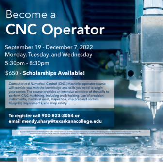 $200 scholarships are available for the 12-week training course that begins September 19. The course costs $650 and is taught on the Texarkana College campus in the Ledwell Workforce Training Center. The For more information or to register, call 903-823-3270 to speak to a TC program specialist or visit www.texarkanacollege.edu/cnc.