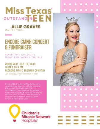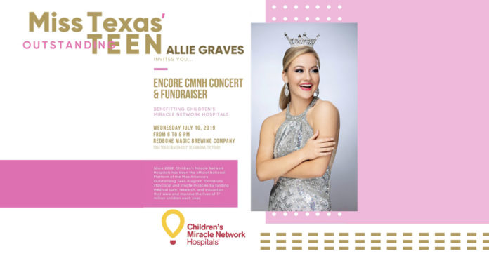 Miss Texas’ Outstanding Teen, Allie Graves, invites you to join her for an encore concert and fundraiser benefitting Children’s Miracle Network Hospitals (CMNH). The event will be held on Wednesday, July 10 from 6:00 p.m. to 9:00 p.m. at Redbone Magic Brewing Company, located at 1304 Texas Boulevard.