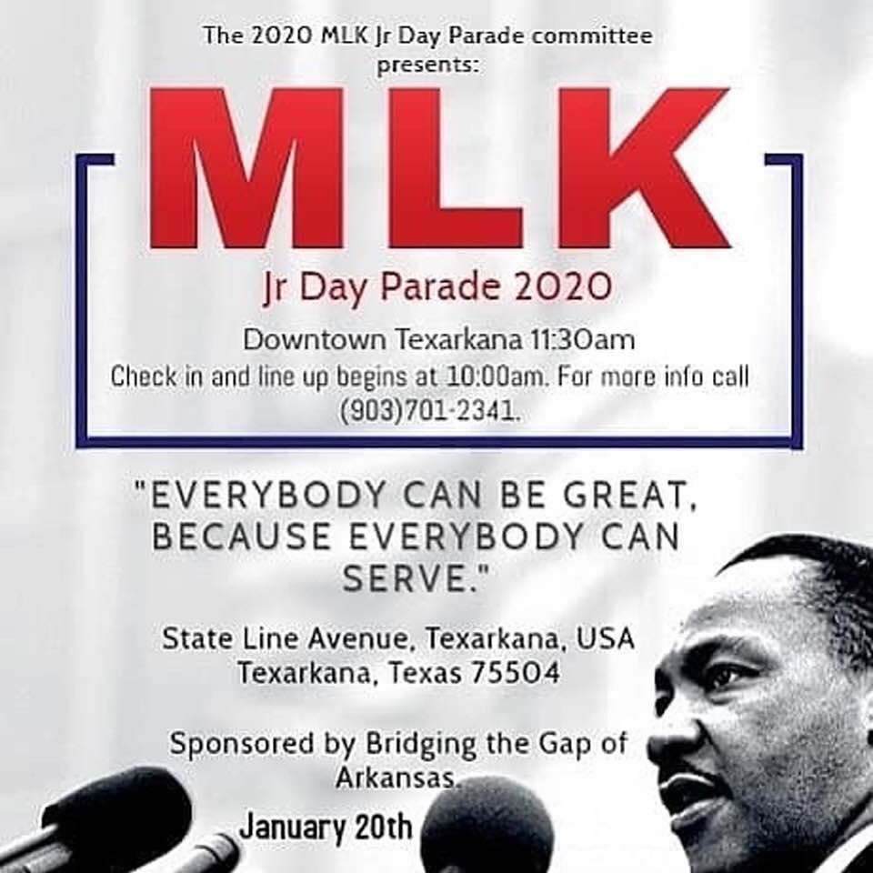 News MLK Parade Happening 11:30 Monday By Field Walsh - January 20, 2020 SPONSOR The fifth annual Dr. Martin Luther King Jr. day parade is Monday at 11:30 a.m. in Downtown Texarkana.