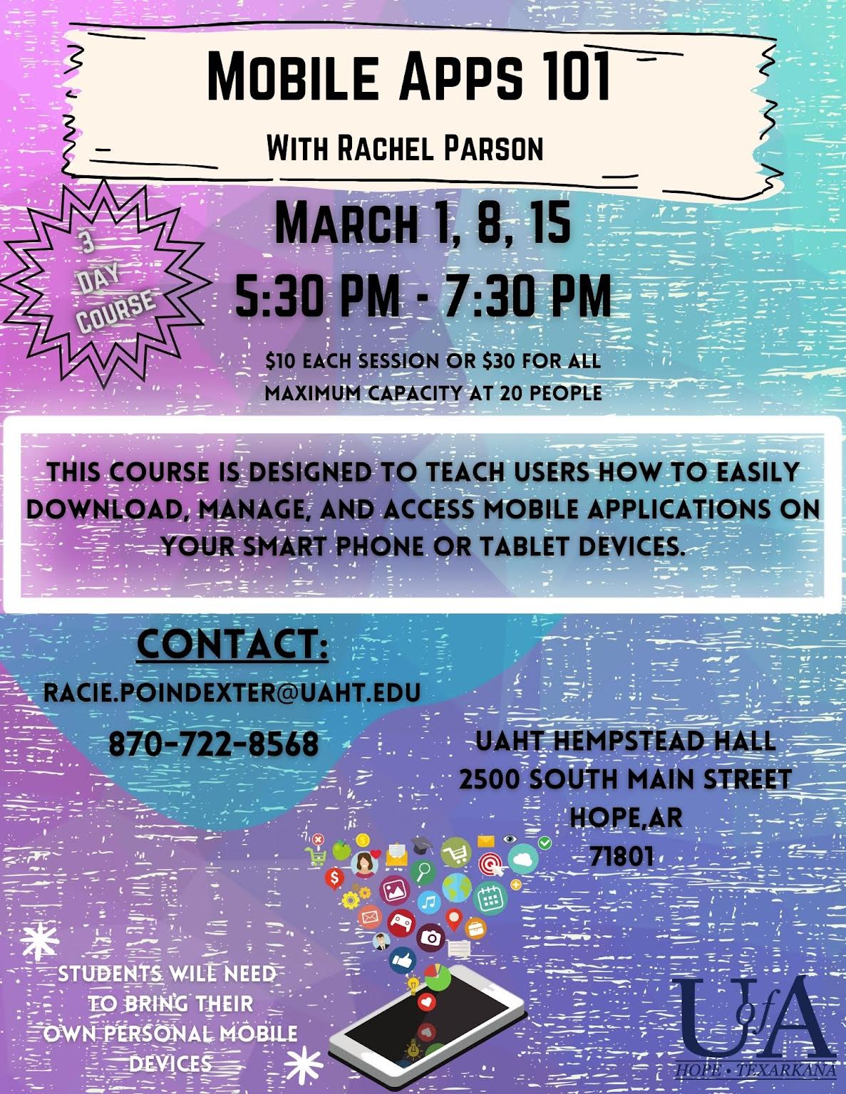 The University of Arkansas Hope-Texarkana is offering a Mobile Apps 101 course on March 1, 8, and 15 from 5:30 to 7:30 p.m. at Hempstead Hall on the Hope campus. The class will teach students to understand, navigate, and learn savvy tricks for apps on mobile devices such as smartphones and tablets.