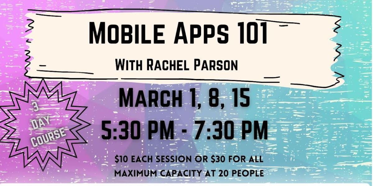 Students must bring their own personal mobile devices. The cost for the course is $10 per session or $30 for all sessions. Spots are limited.