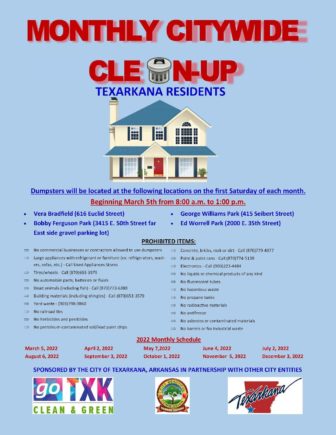 The monthly citywide clean-up continues this Saturday. Dumpsters will be located at four city parks for Texarkana, Arkansas residents (Bobby Ferguson Park, Vera Bradfield Park, George Williams Park, Ed Worrell Park). This program will continue the first Saturday of every month. See attached flyer for more details and contact Public Works for any follow up questions. (870) 779-1354
