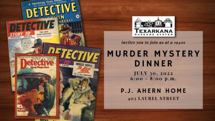 Join us for dinner and a MURDER! The Texarkana Museums System invites you to its latest Murder Mystery Party, “The Cudham Riding Club Murder,” beginning at 6:00 p.m. on July 30 at the P. J. Ahern Home, 403 Laurel Street. Admission is $45 each or $40 for TMS members. Couple’s tickets are $80. TICKETS MUST BE PURCHASED IN ADVANCE. For more information, call 903-793-4831 or visit TexarkanaMuseums.org/Events.