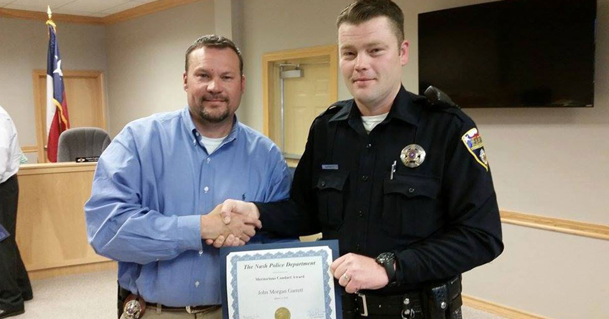 According to Nash Police, Officer Garrett responded to a major accident involving a motorcycle at FM 2148 and Highway 82. As Officer Garrett arrived on scene he located the driver of the motorcycle and proceeded to provide medical care for him.