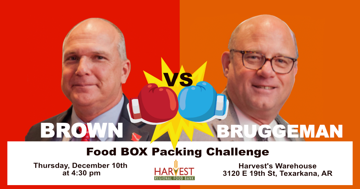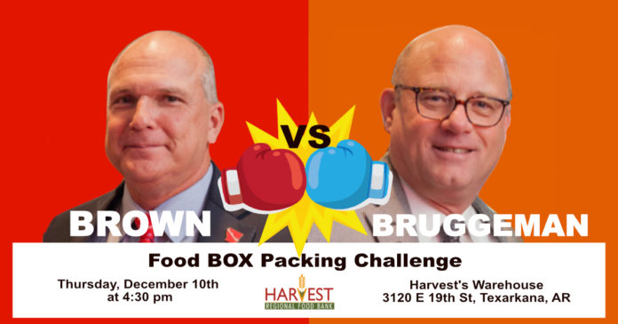 Texarkana, Texas Mayor Bob Bruggeman, Texarkana, Arkansas Mayor Allen Brown and members of each city council/board of directors will compete in a food box packing challenge Thursday, December 10, 2020 at 4:30 at Harvest’s Warehouse at 3120 E 19th Street in Texarkana, Arkansas. Teams will have 30 minutes to pack as many pantry boxes as possible, with the winning city side earning the “Harvest Hunger Hero Packing Champions” title.
